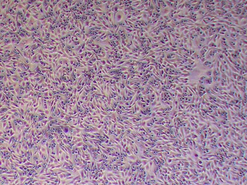 | 传代方法 | 1.弃去培养上清,用不含钙、镁离子的PBS润洗BHK-21细胞1-2次。 2.加1 mL消化液(0.25%Trypsin-0.53mM EDTA)于培养瓶中,使消化液浸润所有细胞,弃去消化液,将培养瓶置于37℃培养箱中消化1 min,然后在显微镜下观察细胞消化情况,若细胞大部分变圆并脱落,迅速拿回操作台,轻敲几下培养瓶后加少量培养基终止消化。 3.按6-8 mL/瓶补加培养基,轻轻打匀后装入无菌离心管中,1000 rpm离心4 min,弃去上清液,补加1-2 mL培养液后吹匀。 4.将细胞悬液按1:2比例分到新的含8 mL培养基的新皿中或者瓶中,置于培养箱中培养。 | |||