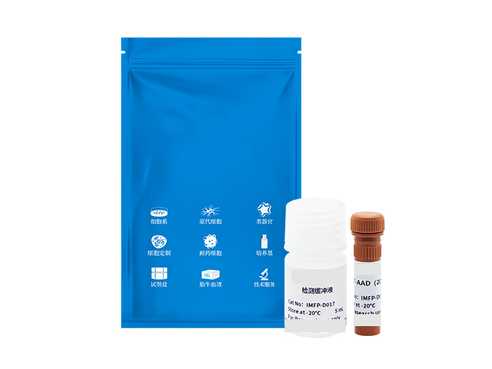 7-AAD细胞活力检测试剂盒(7-AAD Cell Viability Assay Kit)是一种基于远红荧光探针7-AAD (7-aminoactinomycin D)特异性染色细胞膜丧失完整性的坏死细胞的特性开发的能够特异地对坏死细胞的细胞核进行染色从而检测细胞坏死的试剂盒。本试剂盒可与Annexin V-FITC/EGFP/PE、Calcein AM等联用而用于细胞凋亡与坏死或死活的检测,适用于流式细胞仪、荧光显微镜或其它荧光检测设备。