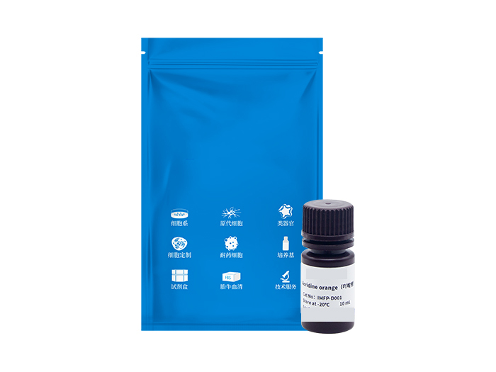 吖啶橙(Acridine Orange, AO),是一种常用的三环芳香类阳离子型碱性荧光染料,分子量为301.82,可以染色和标记DNA、RNA。吖啶橙具有膜通透性,能透过细胞膜,使DNA和RNA染色,因此吖啶橙常用于细胞内DNA和RNA的检测。吖啶橙以插入的形式与DNA双链结合,此时其荧光发射峰为530nm,激发后呈绿色荧光;吖啶橙也可以离子相互作用和染料堆积的形式与RNA或单链DNA结合,此时其荧光发射峰为640nm,激发后呈红色荧光。吖啶橙也可以通过pH依赖性方式进入酸性细胞器如溶酶体中,从而用于自噬的研究,但其染色缺乏特异性。