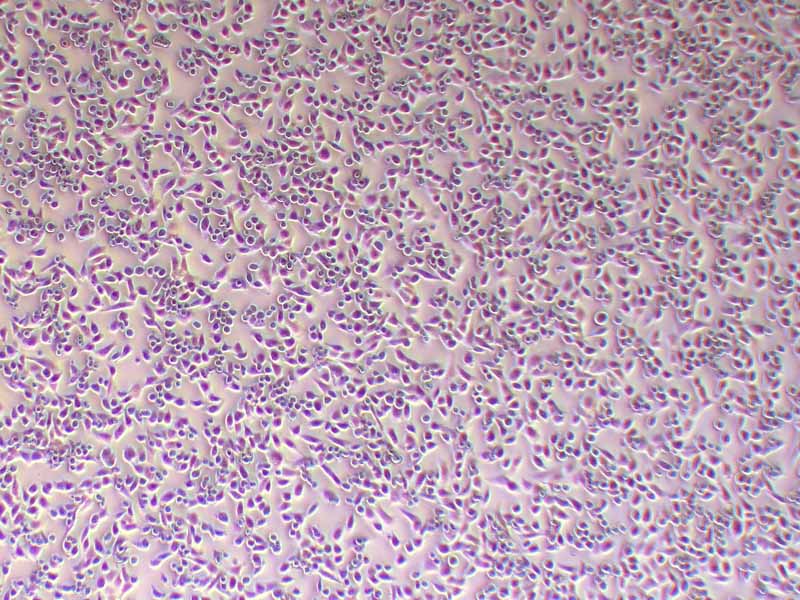 传代方法 | 1.弃去培养上清,用不含钙、镁离子的PBS润洗SCC7-LUC细胞1-2次。 2.加1 mL消化液(0.25%Trypsin-0.53mM EDTA)于培养瓶中,使消化液浸润所有细胞,弃去消化液,将培养瓶置于37℃培养箱中消化1 min,然后在显微镜下观察细胞消化情况,若细胞大部分变圆并脱落,迅速拿回操作台,轻敲几下培养瓶后加少量培养基终止消化。 3.按6-8 mL/瓶补加培养基,轻轻打匀后装入无菌离心管中,1000 rpm离心4 min,弃去上清液,补加1-2 mL培养液后吹匀。 4.将细胞悬液按1:2比例分到新的含8 mL培养基的新皿中或者瓶中,置于培养箱中培养。 | |||