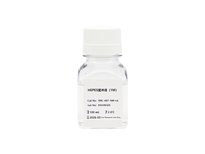 HEPES全称为N-2-Hydroxyethylpiperazine-N-2-Ethane Sulfonic Acid,中文名称为4-羟乙基哌嗪乙磺酸,是一种常用的生物缓冲剂,有效缓冲范围为pH6.8-8.2。HEPES最大的优点是,能够在开放环境中较长时间恒定溶液的PH范围。HEPES不能通过生物膜,对生化反应影响有限,是一种化学和酶稳定的物质,而且HEPES对可见光和紫外光的吸收度极低。因此一般认为,HEPES是一种优良的生物缓冲剂,对细胞无毒性作用,使用终浓度为10-50 mM,细胞培养常用10 mM。