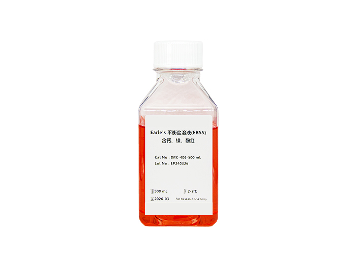 EBSS 缓冲液,即 Earle’s Balanced salt Solution,Earle’s 平衡盐溶液,是细胞分离 或培养中常用的磷酸盐缓冲液之一。主要成分为葡萄糖,NaHCO3,NaCl,KCl 和 NaH2PO4,具有 维持渗透压、保持 pH 稳定、提供简单营养等作用,可用于体外实验中组织块、器官或细胞的漂洗、细胞或组织的运输、细胞培养用试剂的配制以及作为细胞计数的稀释液等。根据需要可 添加钙、镁离子及酚红指示剂。