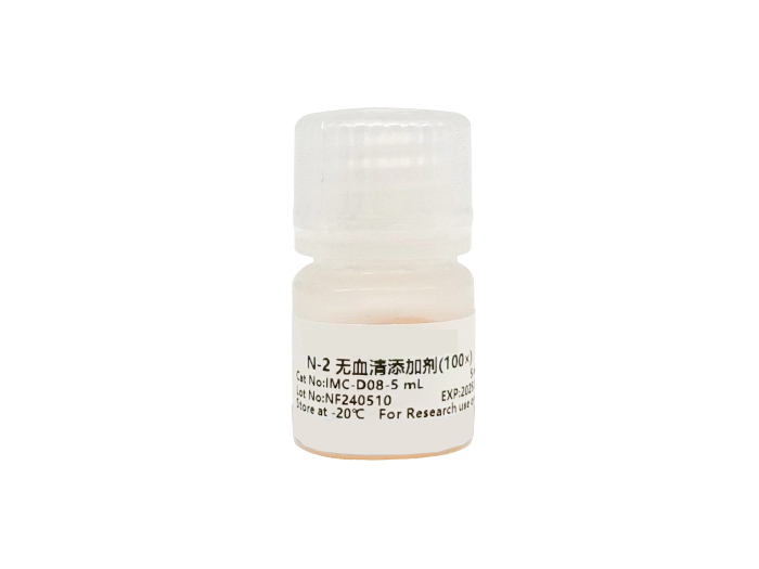 N-2 Serum-Free Supplement (100×),即N-2无血清添加剂(100x),是化学成分确定的100X浓缩型细胞培养添加剂。N-2 Serum-Free Supplement具有促进细胞生长和存活的作用,常用于神经元、神经干细胞、神经瘤细胞等的培养,以及多能干细胞的培养和定向分化。N-2 Serum-Free Supplement主要被推荐用于神经母细胞瘤以及周围神经系统(PNS)与中枢神经系统(CNS)来源的有丝分裂后期的神经元的生长和表达。N-2 Serum-Free Supplement可与添加了生长因子如 bFGF 及 EGF 的无血清神经元基础培养基,或 DMEM/F12培养基配合使用。