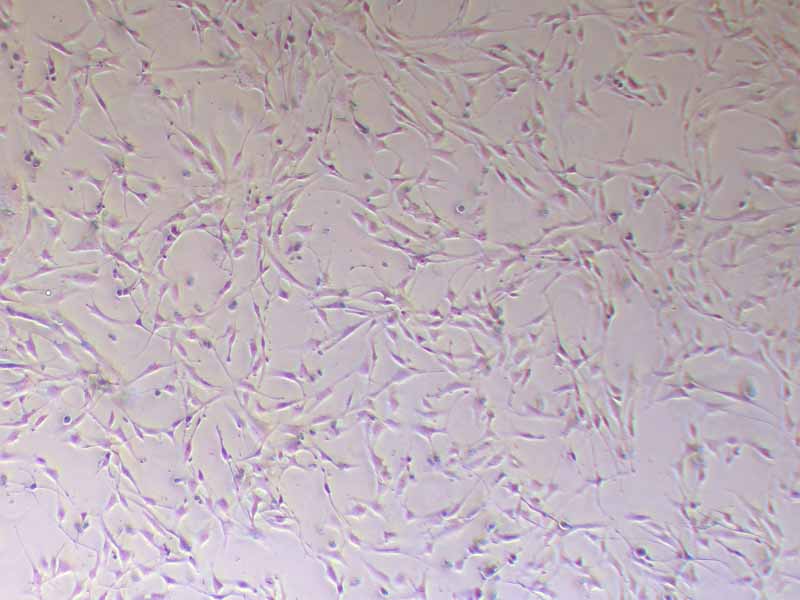 | 传代方法 | 1.弃去培养上清,用不含钙、镁离子的PBS润洗细胞1-2次。 2.加1 mL消化液(0.25%Trypsin-0.02% EDTA)于培养瓶中,使消化液浸润所有细胞,弃去消化液,将培养瓶置于37℃培养箱中消化1 min,然后在显微镜下观察细胞消化情况,若细胞大部分变圆并脱落,迅速拿回操作台,轻敲几下培养瓶后加少量培养基终止消化。 3.按6-8 mL/瓶补加培养基,轻轻打匀后装入无菌离心管中,1000 rpm离心4 min,弃去上清液,补加1-2 mL培养液后吹匀。 4.将细胞悬液按1:2比例分到新的含8 mL培养基的新皿中或者瓶中,置于培养箱中培养。 | |||