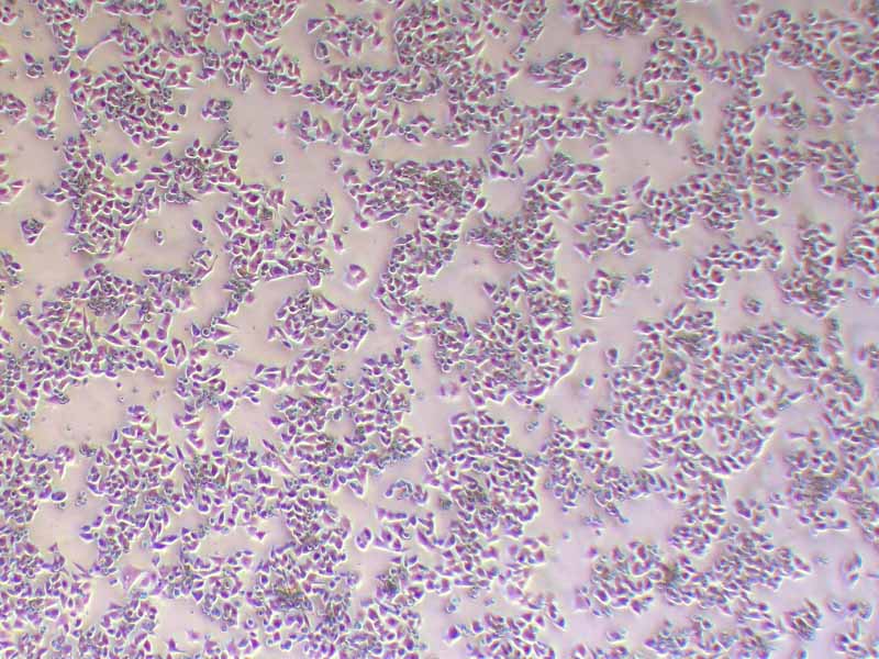1.弃去培养上清,用不含钙、镁离子的PBS润洗SK-CO-1细胞1-2次。 2.加1 mL消化液(0.25%Trypsin-0.02% EDTA)于培养瓶中,使消化液浸润所有细胞,弃去消化液,将培养瓶置于37℃培养箱中消化1 min,然后在显微镜下观察细胞消化情况,若细胞大部分变圆并脱落,迅速拿回操作台,轻敲几下培养瓶后加少量培养基终止消化。 3.按6-8 mL/瓶补加培养基,轻轻打匀后装入无菌离心管中,1000 rpm离心4 min,弃去上清液,补加1-2 mL培养液后吹匀。 4.将细胞悬液按1:2比例分到新的含8 mL培养基的新皿中或者瓶中,置于培养箱中培养。 |