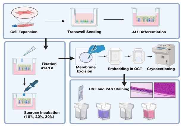 气道上皮是呼吸防御核心,NHBECs ALI 模型因模拟体内结构(黏液纤毛分化、屏障形成),广泛用于毒理学与疾病建模。但现有方案中,Transwell 膜冷冻切片、染色的技术细节未标准化,膜包埋易损、漂洗 / 切片厚度影响染色质量。本研究提供完整分步流程,优化 OCT 包埋、Coplin jar 漂洗等技术,提升可重复性,适用于上皮重塑、黏蛋白研究及环境暴露响应评估。