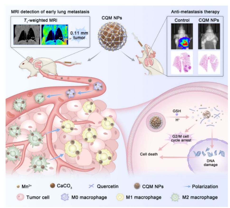 CQM NPs成功合成,粒径约105.71 nm,具有pH/GSH双响应释放特性。体外安全性良好,可诱导巨噬细胞先M2后M1的序贯极化。MRI成像灵敏度高,可检测0.11 mm的微小转移灶。通过巨噬细胞“搭便车”机制实现肿瘤靶向递送,显著抑制肺转移灶生长(减少81.64%),并预防转移形成(减少78.08%)。该研究为肺转移瘤的早期诊断与治疗提供了一体化纳米诊疗平台。