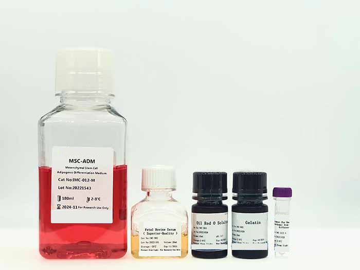 由IMMOCELL研发团队精心研制的间充质干细胞成脂诱导分化试剂盒,包含适合间充质干细胞生长的基础培养基、优级胎牛血清及诱导细胞分化所需的添加物。
