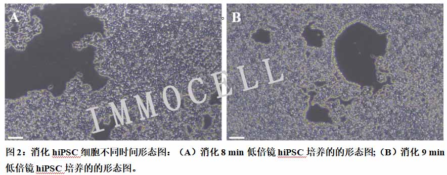 图2:消化hiPSC细胞不同时间形态图:(A)消化8 min低倍镜hiPSC培养的的形态图;(B)消化9 min低倍镜hiPSC培养的的形态图。
