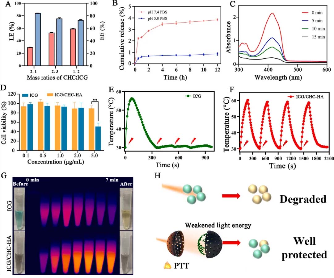 ICG/CHC-HA的LE和EE,ICG/CHC-HA的药物释放曲线,以及ICG/CHC-HA在日光照射下的细胞存活率。