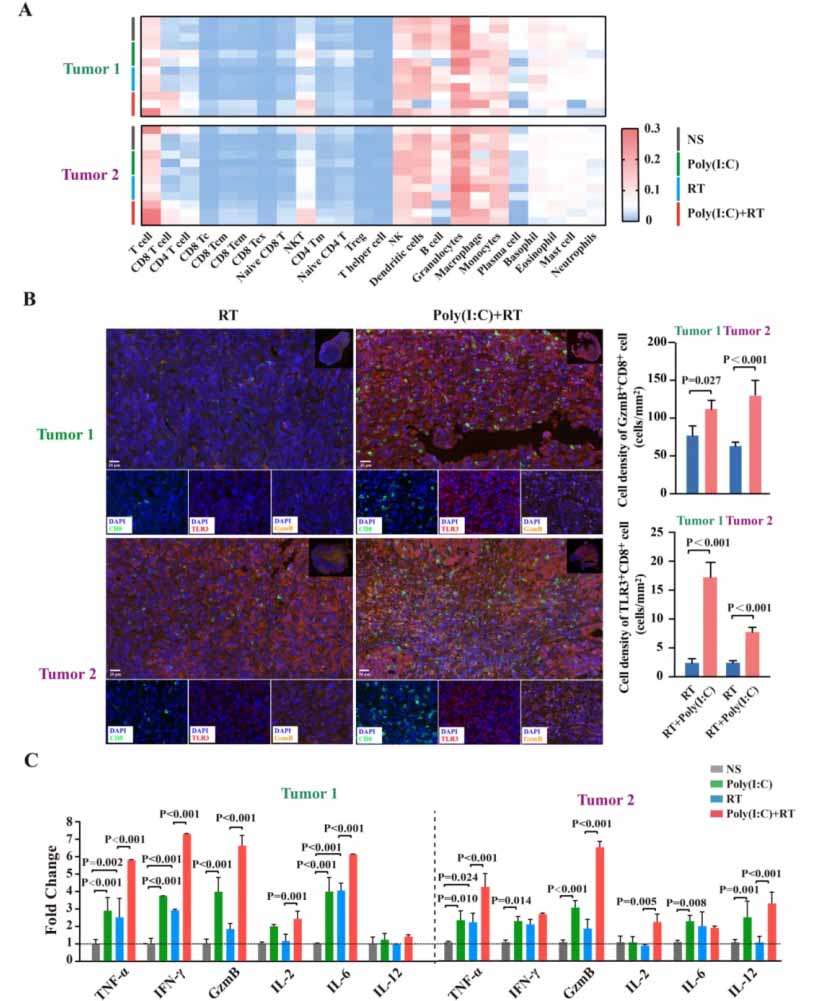 图5. 聚肌苷酸(Poly(I:C))促进放射治疗后肿瘤组织的T细胞浸润。