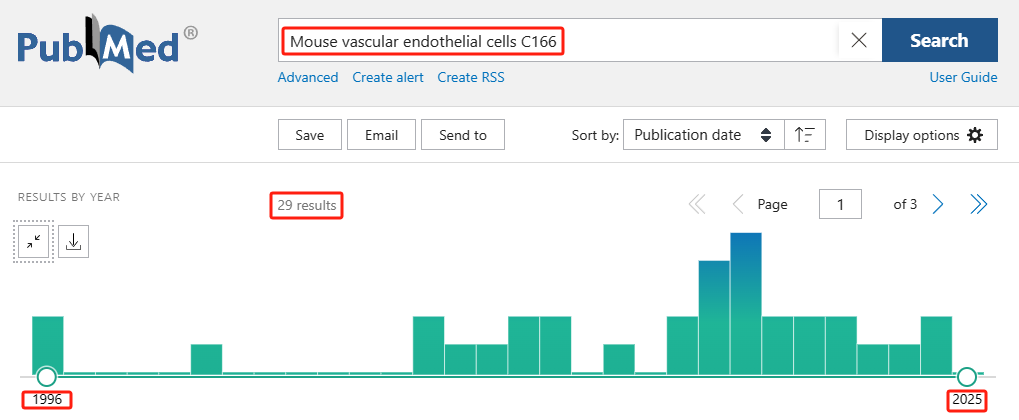 在pubmed数据库中用“Mouse vascular endothelial cells C166”搜索该关键词,第一篇为1996年S J Wang 在“In Vitro Cell Dev Biol Anim.”上发表的“Isolation and propagation of yolk-sac-derived endothelial cells from a hypervascular transgenic mouse expressing a gain-of-function fps/fes proto-oncogene”。